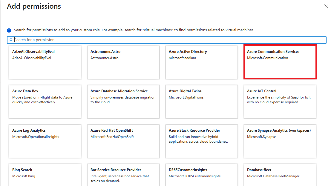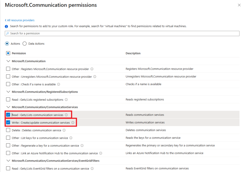 Microsoft.Communication/CommunicationServices e selezionare i seguenti permessi: