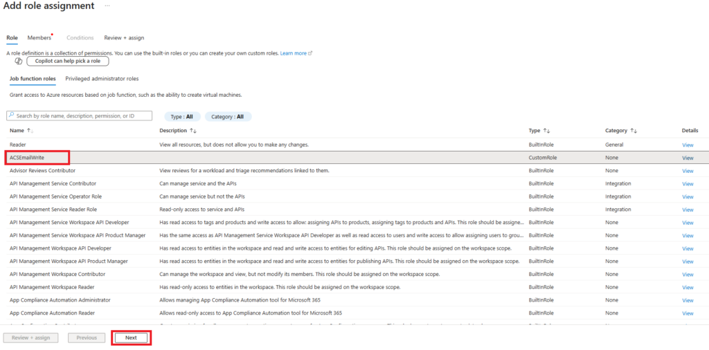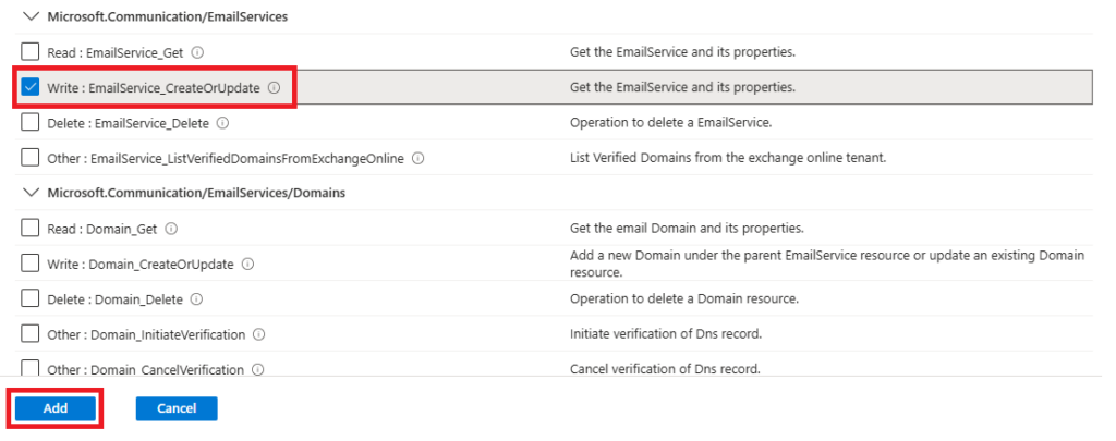 Microsoft.Communication/EmailServices e selezionare il permesso: