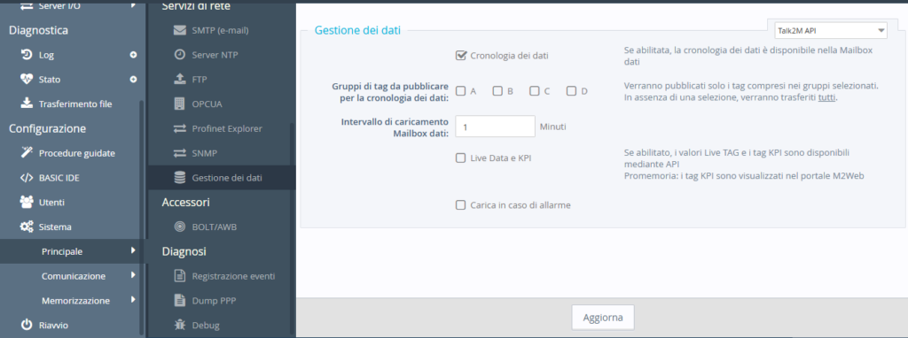 Cliccare su “Configurazione” –> “Principale” –> “Gestione dei dati” e seleziona Talk2M API nel menu in alto a destra: