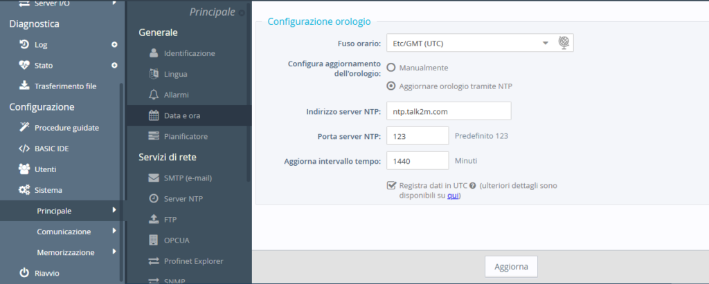 Scegli il fuso orario e seleziona “Aggiornare orologio tramite NTP”, imposta l’aggiornamento a 1440 minuti e abilita “Registra dati in UTC”. Una volta terminato cliccare il pulsante “Aggiorna”.