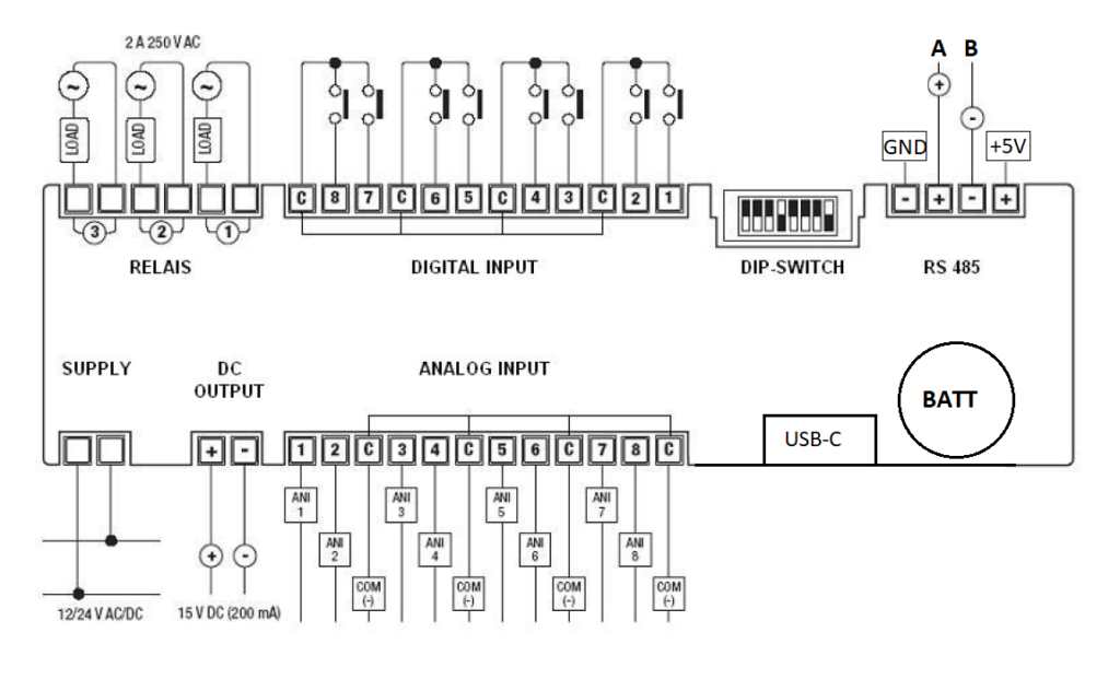 - 8 ingressi analogici a 16-bit selezionabili in corrente/tensione (0-20mA / 0-10V) (con riferimento comune). Campionamento >1Hz
