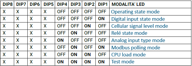 Flashing signals are in order of priority. For example, if the APN is not configured and the SIM is not inserted, 7 LEDs will flash, the error on the APN (5 flashing LEDs) will only be reported after fixing the higher priority errors.